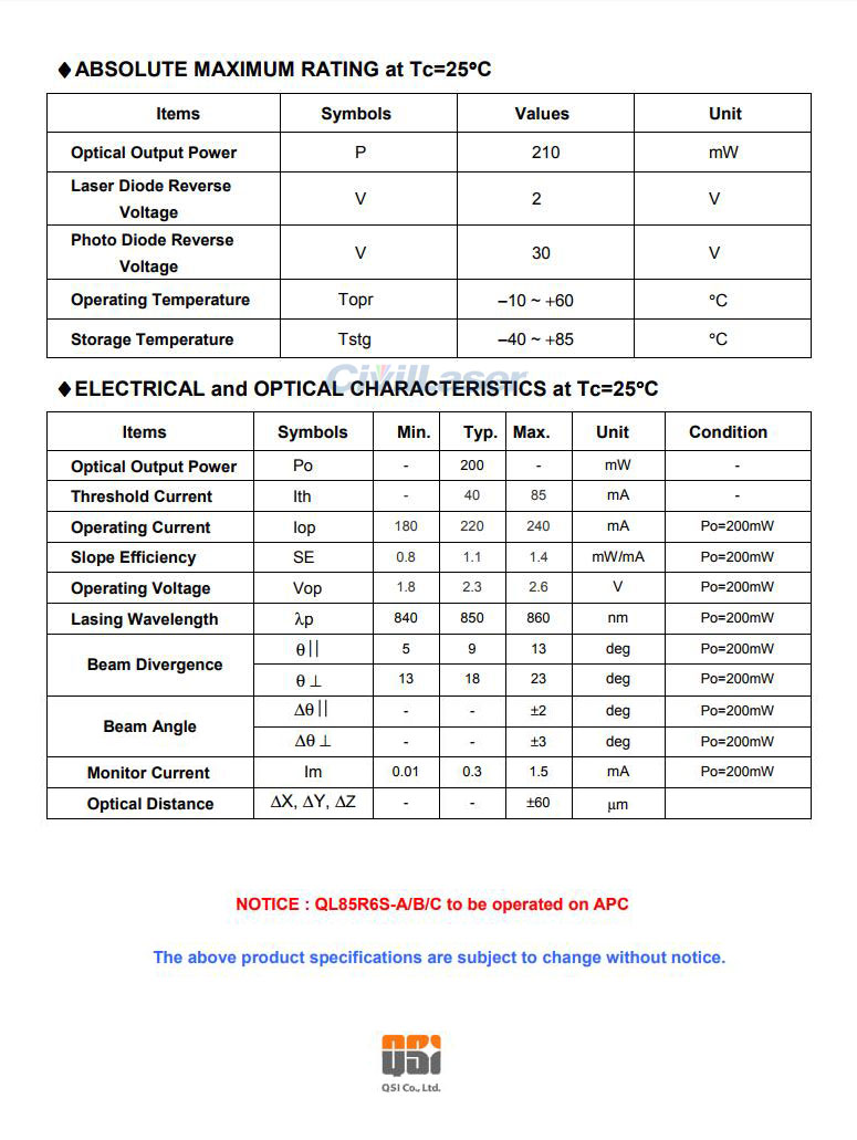 QL85R6S-A/B/C is a MOCVD grown 850nm band AlGaAs laser diode with quantum well structure. It's an attractive light source, with a typical light output power of 200mW for industrial optical module and sensor applications.