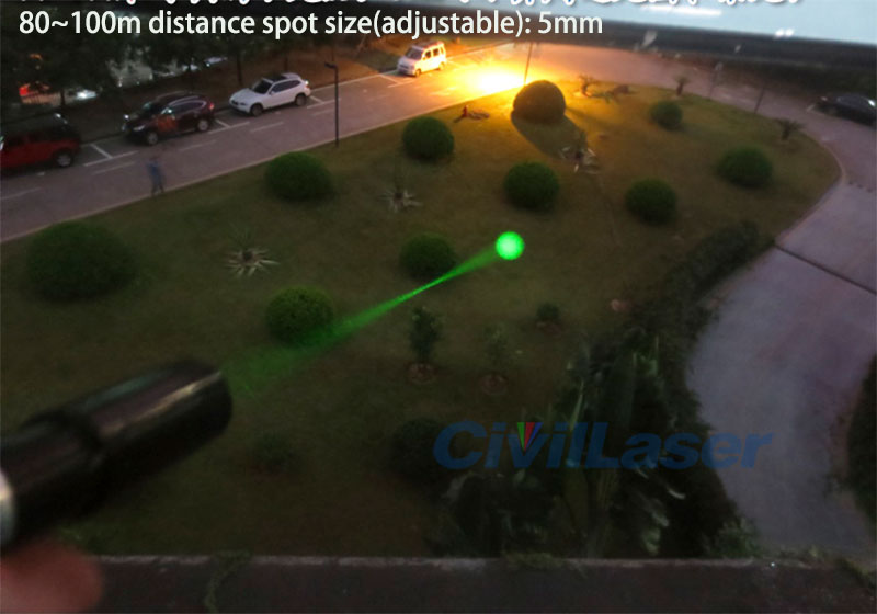 80-100 meters adjustable small spot: 5mm (Nota: Not counting the peripheral aperture and stray light)