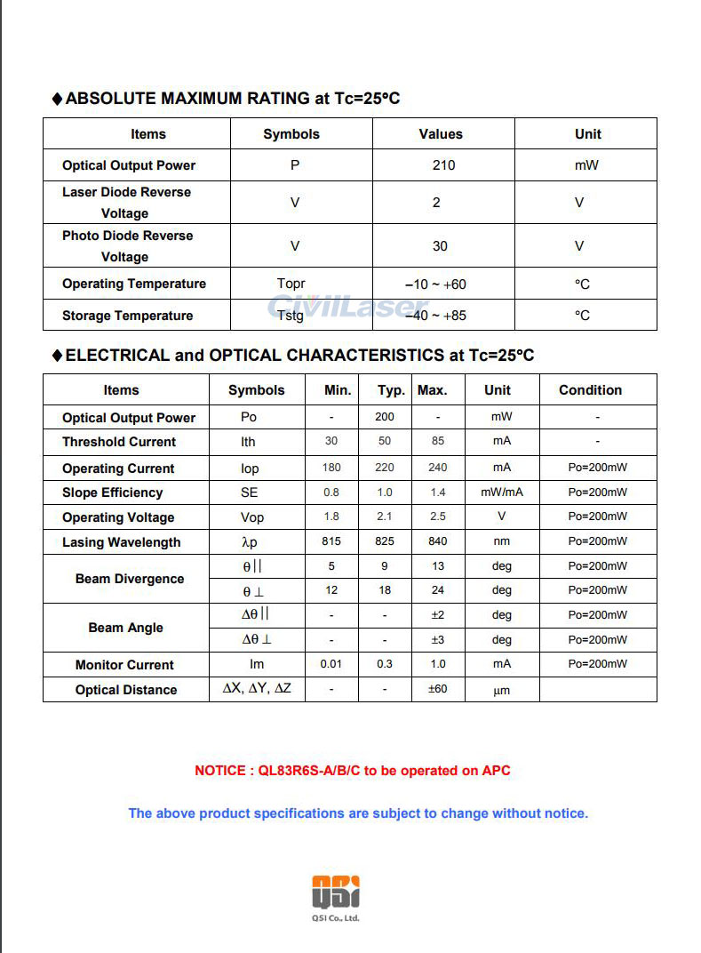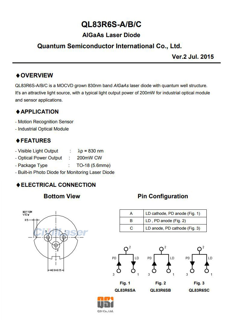 QL83R6S-A/B/C is a MOCVD grown 830nm band AlGaAs laser diode with quantum well structure. It's an attractive light source, with a typical light output power of 200mW for industrial optical module and sensor applications.