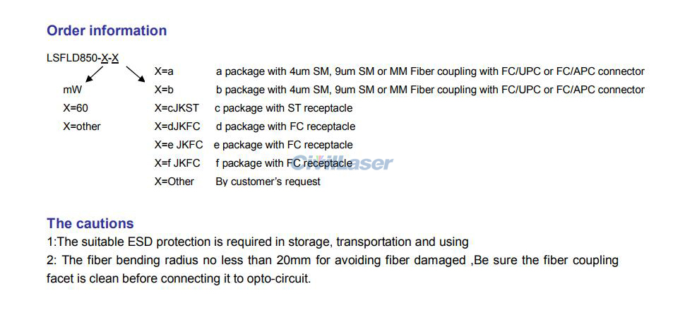 850nm 60mW FP Single-Mode Fiber Coaxial Diodo láser