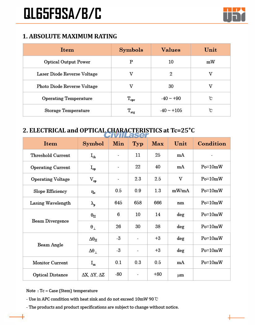 Rojo Diodo láser QSI QL65F9SX 650nm 10mW LD 5.6mm Package