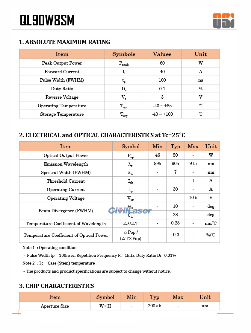 QL90W8SM 50W Short Pulse Operation QSI 905nm Infrarrojo Diodo láser