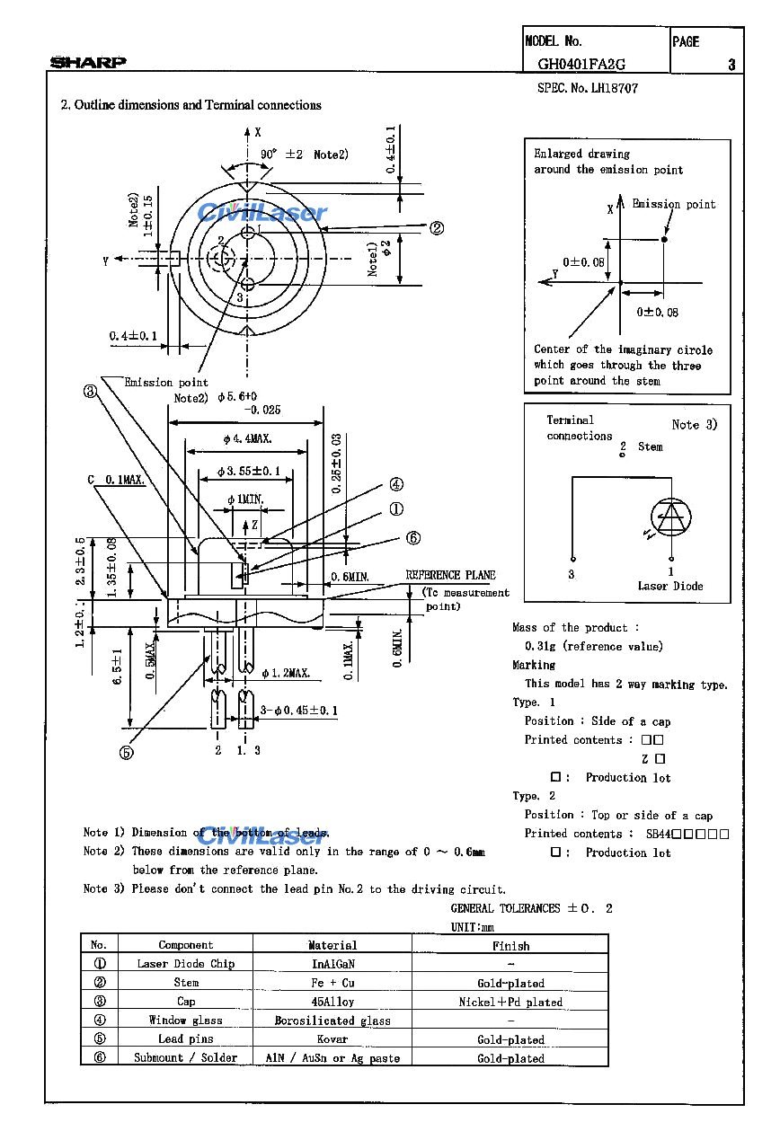 Sharp GH0401FA2G 405nm 150mW LD without PD Diodo láser TO18