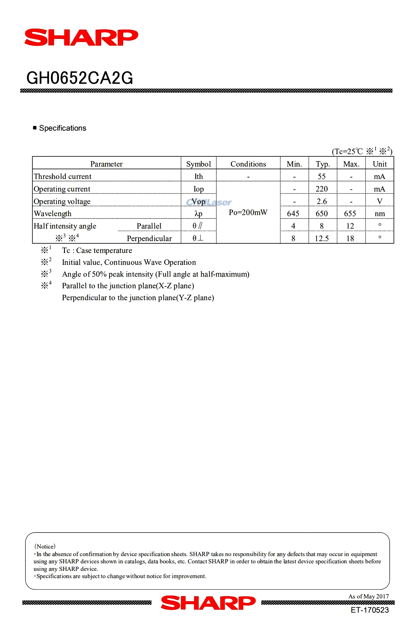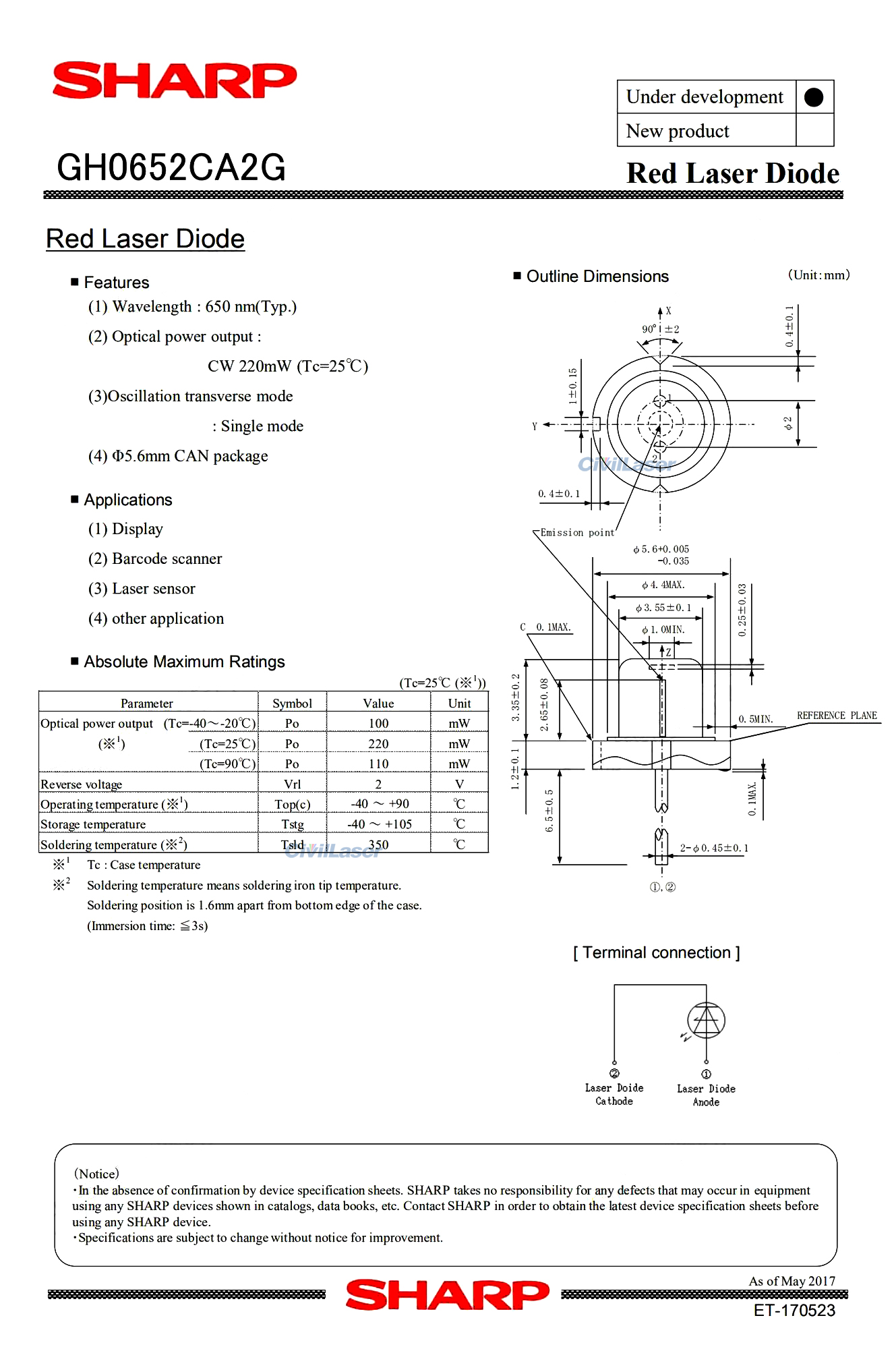 Sharp GH0652CA2G 660nm 220mW Rojo Diodo láser TO18 Package