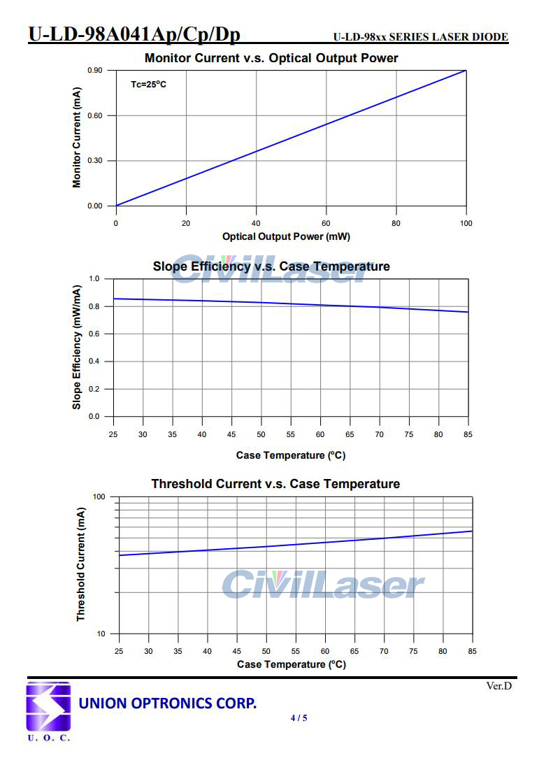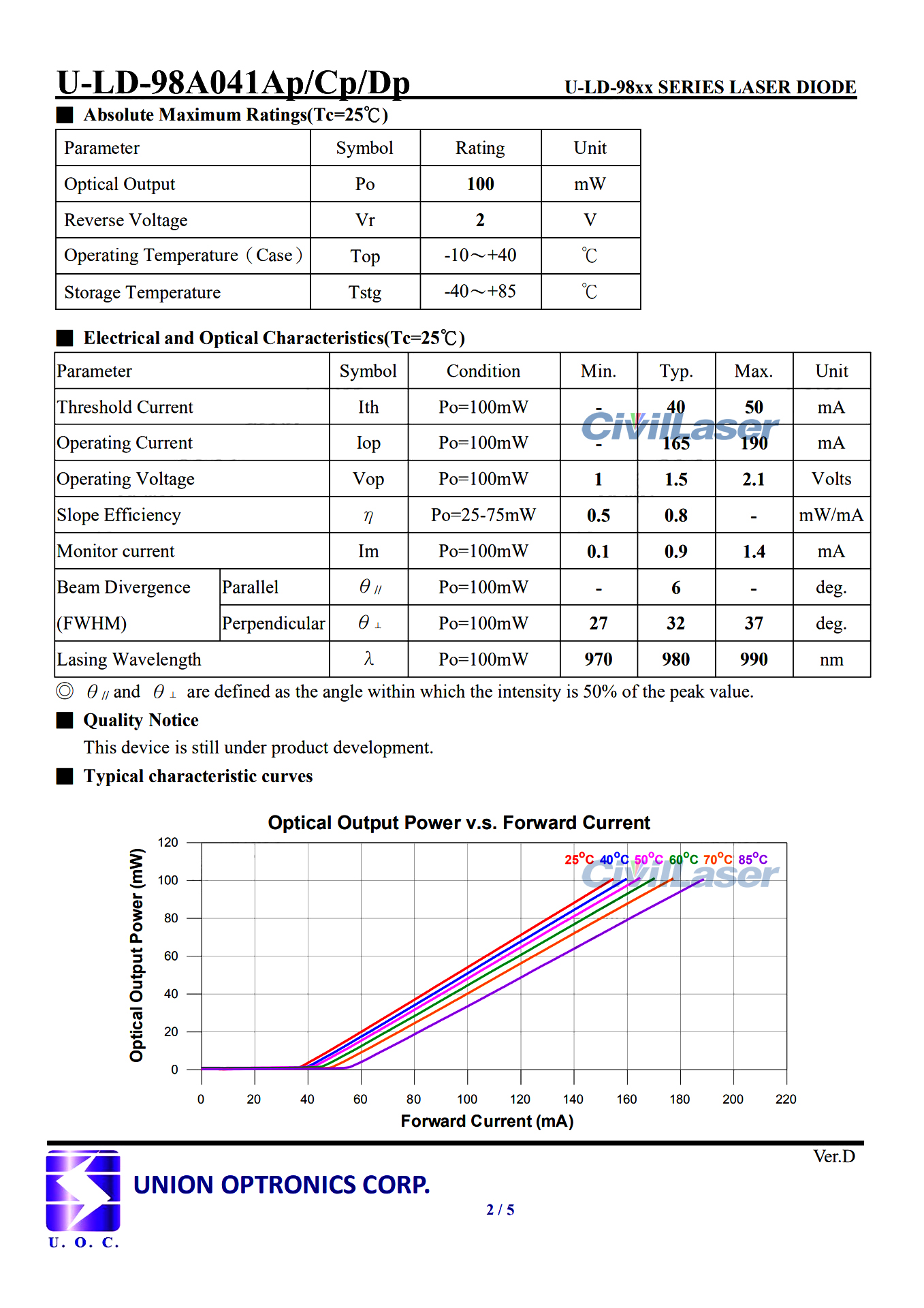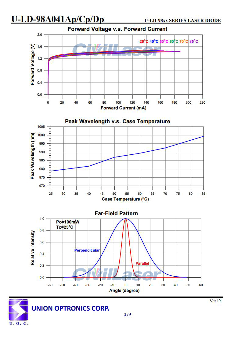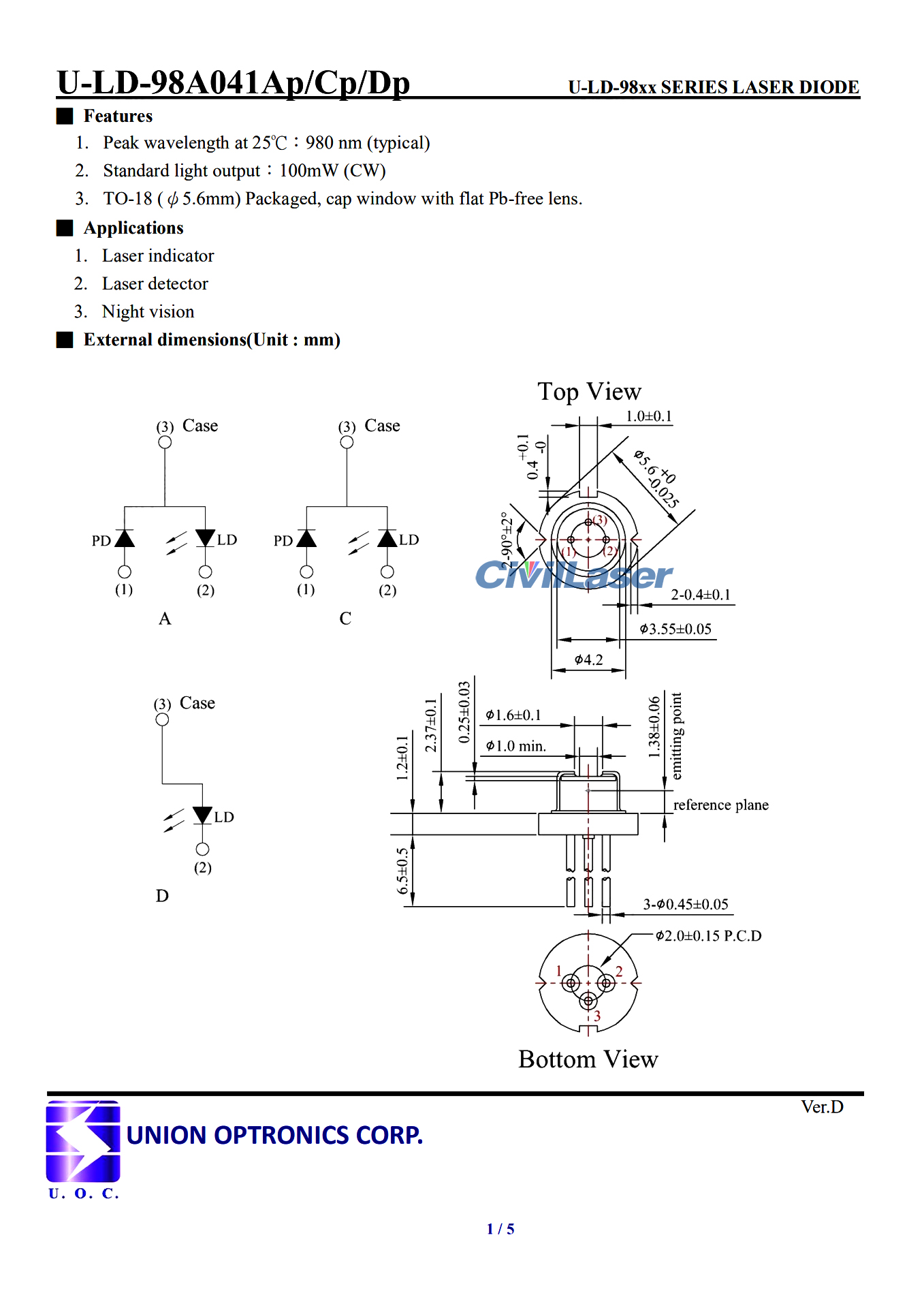 Union U-LD-98A041Ap/Cp/Dp 980nm 100mW Diodo láser IR TO18 Package