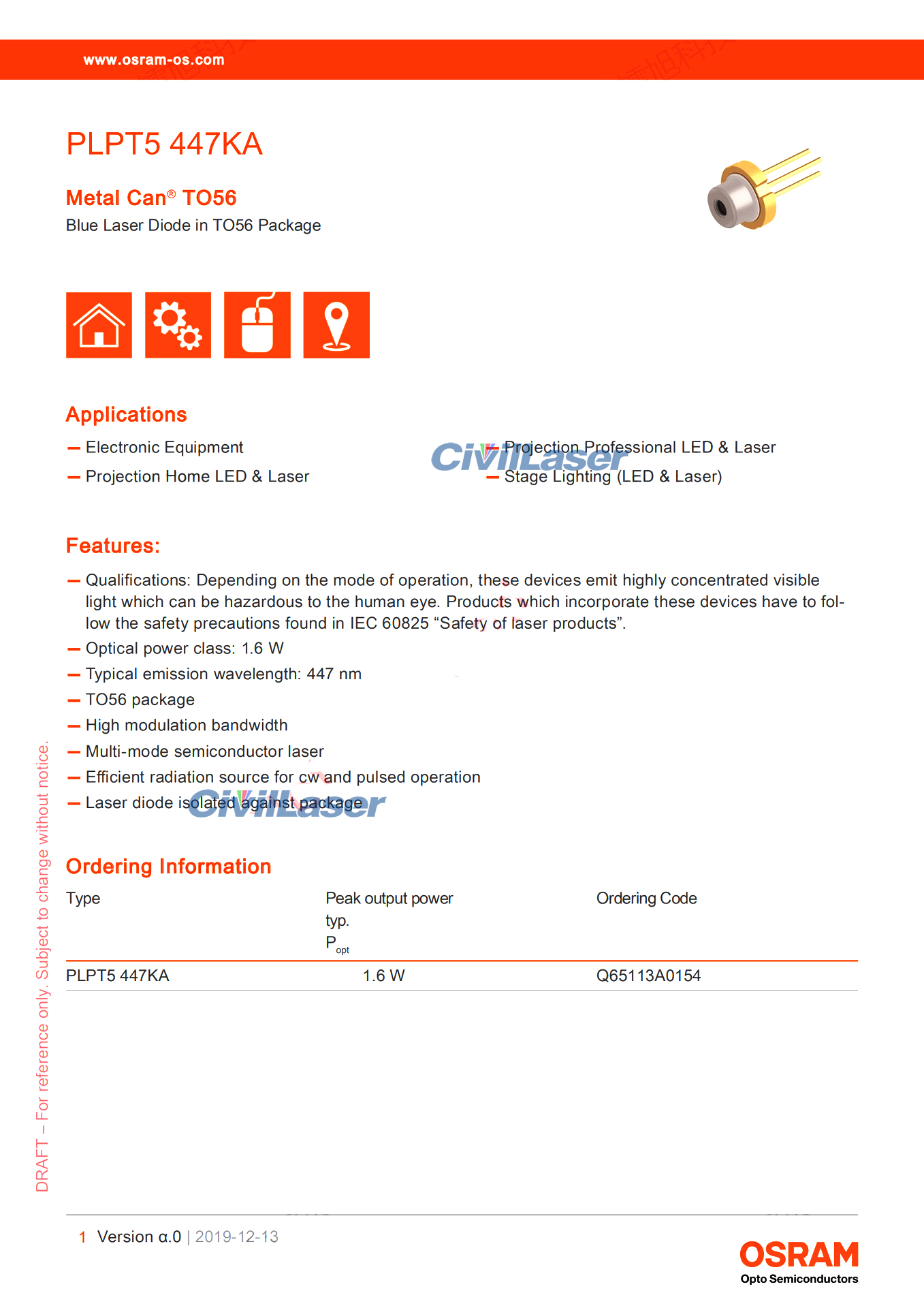 Osram PLPT5 447KA 447nm 1.6W Diodo láser Alto Voltaje Azul LD TO56 Package