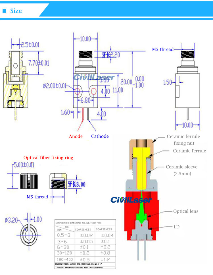2. Laser module needs an appropriate laser driver(PCB). When the laser module connects with power supply, please set the output voltage to zero. The adjustment of the current should be slowly increased or decrease to avoid damaging the device.
