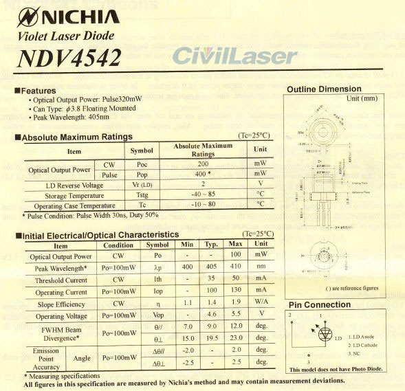 Brand New 405nm 200mw Azul Violet Nichia Powerful Diodo láser LD NDV4542/3.8