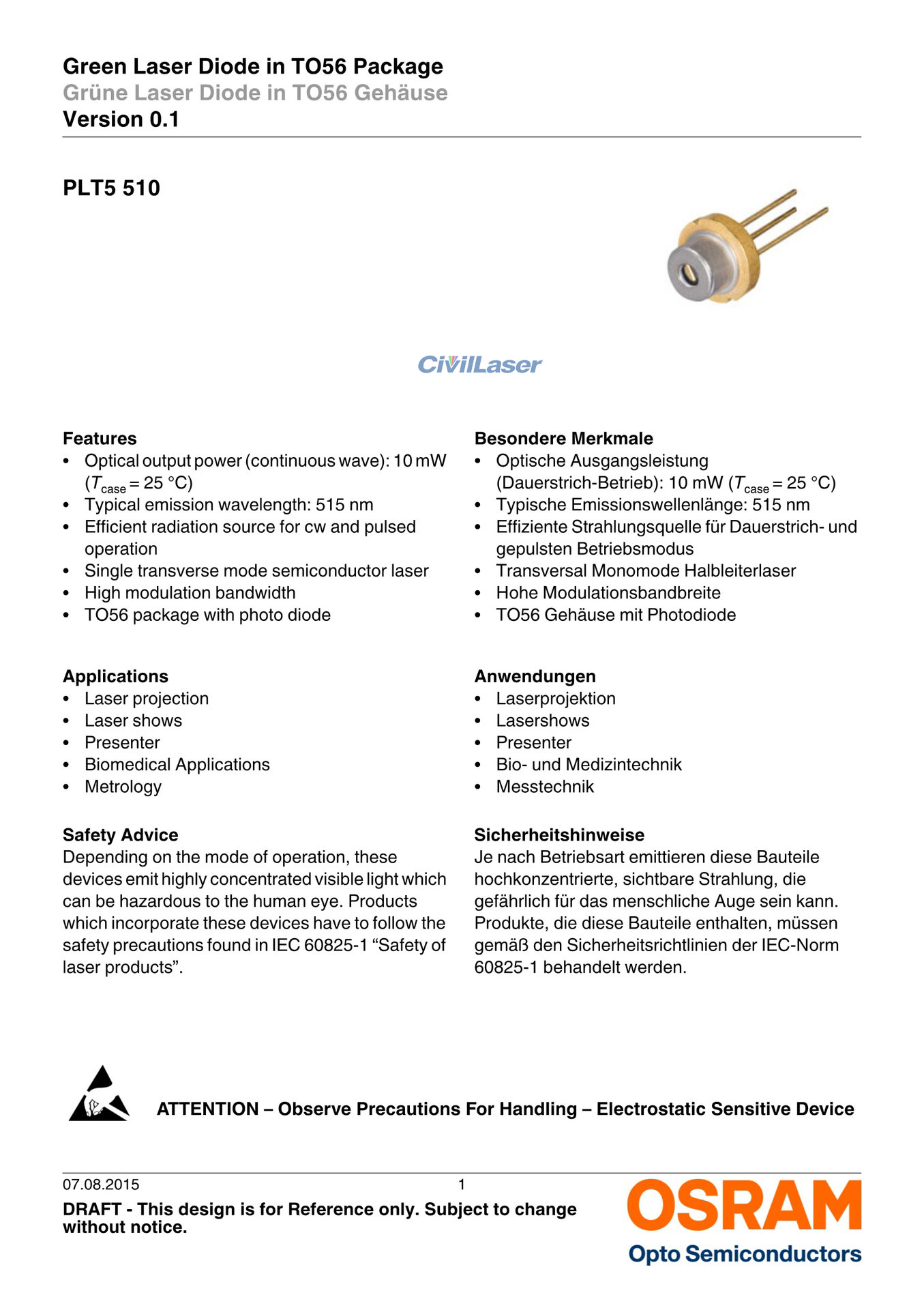 510nm 10mW 15mW OSRAM LD PTL5 510 TO56 Diodo láser verde