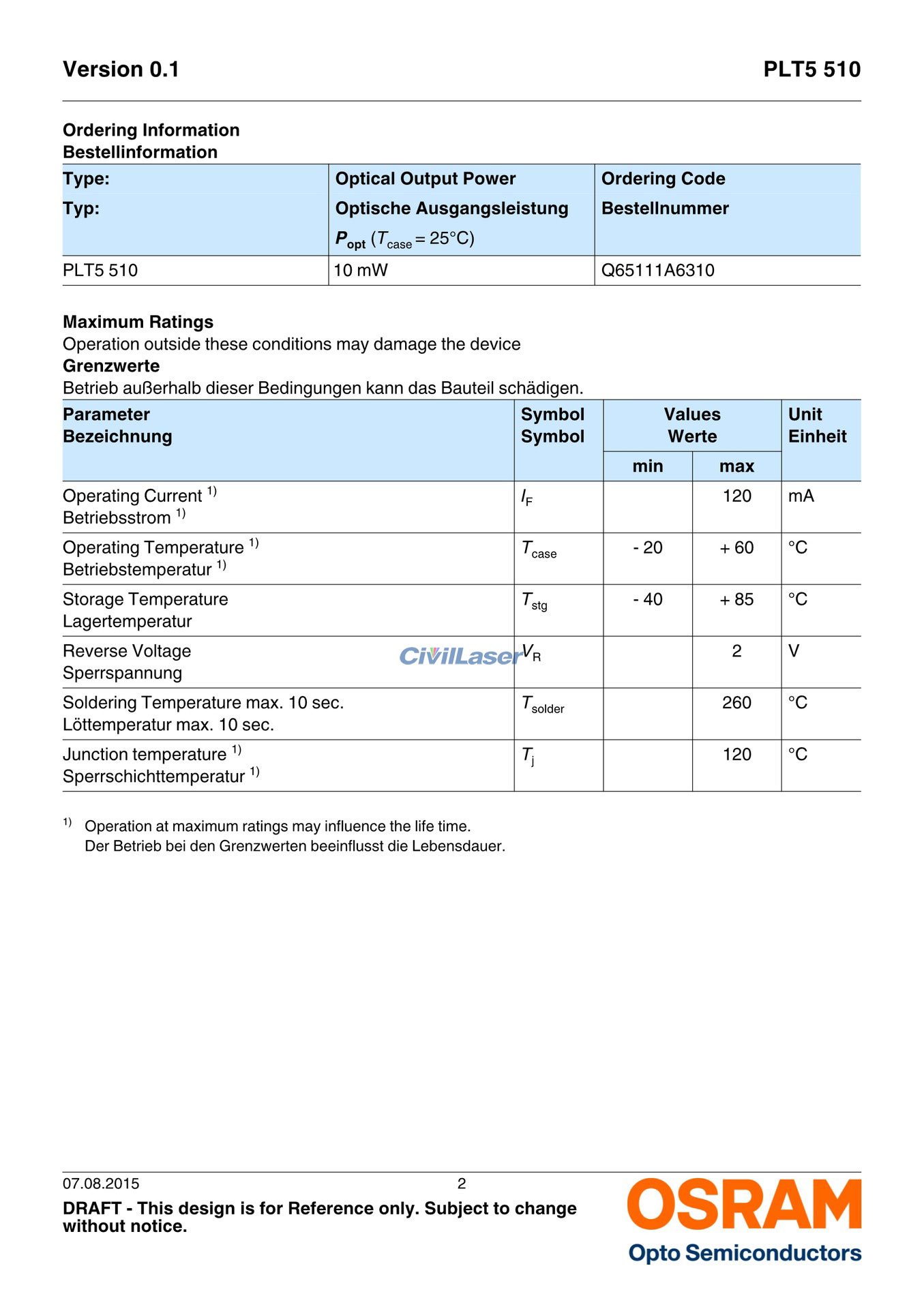 Optical output power (continuous wave):10mW(Tcase=25℃)