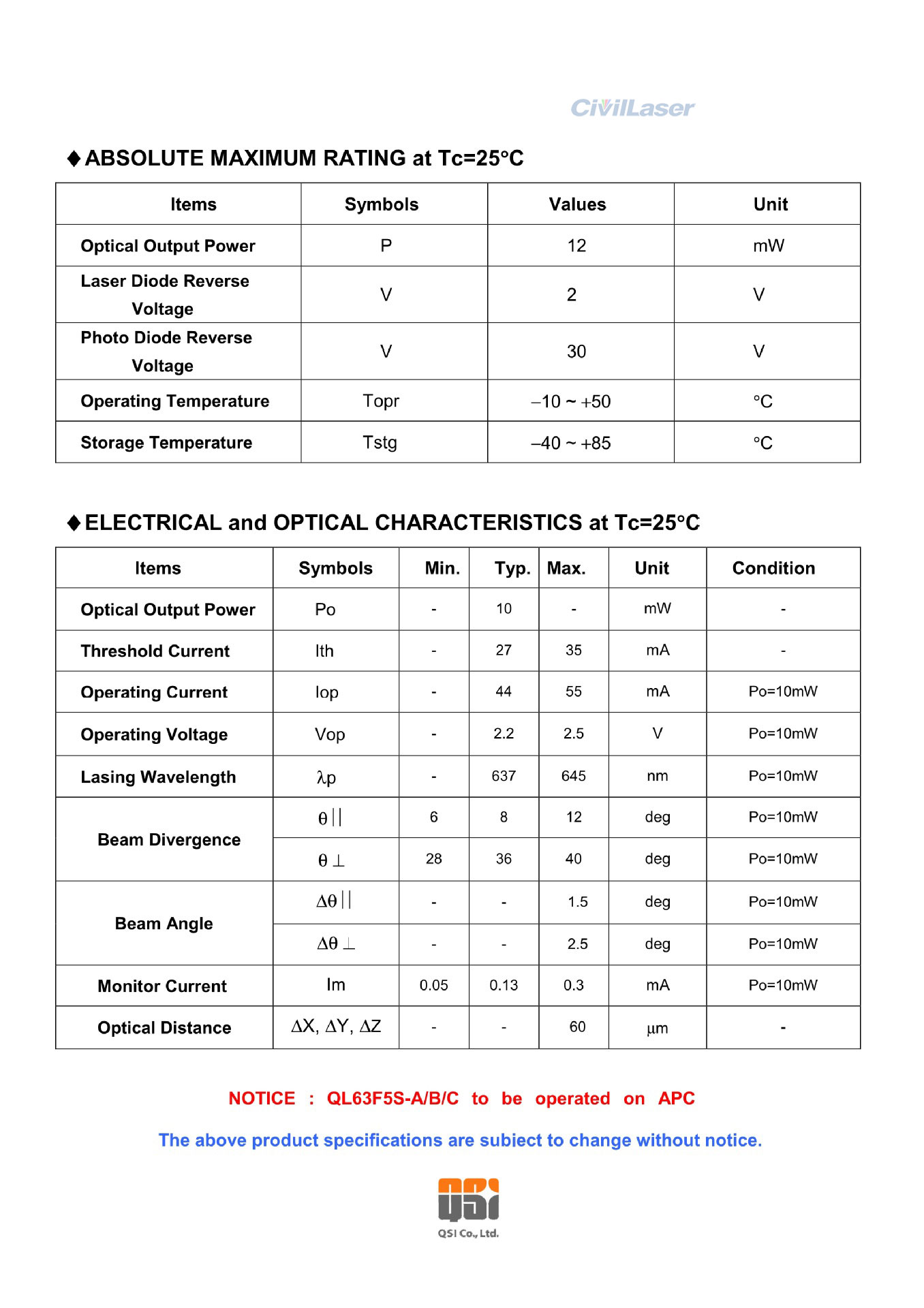Optical output power :10mW CW