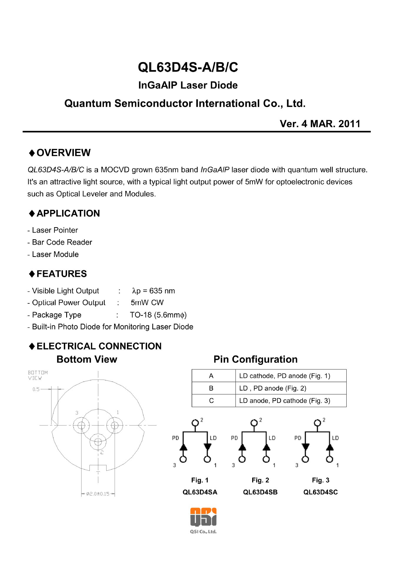 QSI QL63D43X LD 635nm 5mW Rojo Diodo láser TO-18