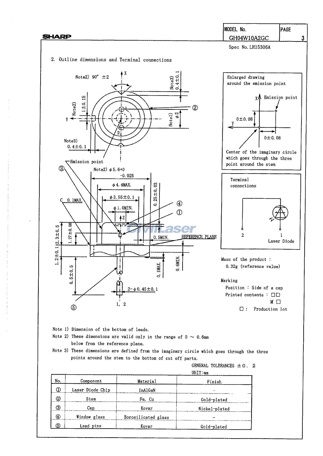 This is a 350mw 405nm Diodo láser GH04W10A2GC. It is a Cut-PIN 405nm Violet Laser Emitter Diode.  It is intended to be used for ordinary electronic equipment such as office equipment, measurement instruments and household appliances. However, this LD is classified in class 4 of IEC60825-1 and 21 CRF Part 1040.10 Safety Standards. Please be careful to use it.