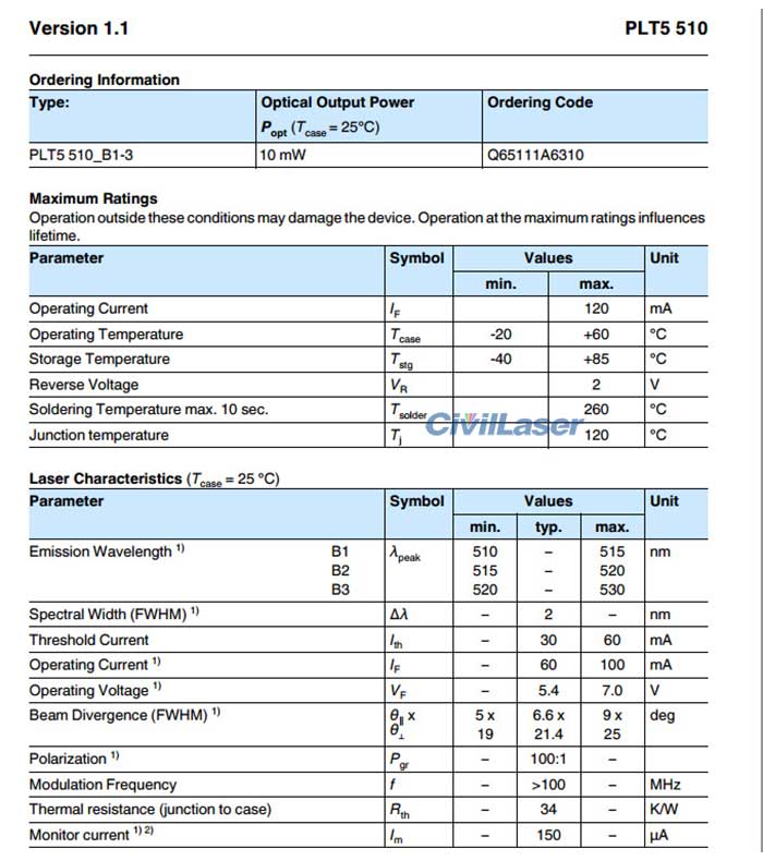 [Especificaciones] Product Brand: Osram Product Model: PLT5 510 Longitud de onda: 520nm Potencia de salida: 10mW Operating Temperature: -20 ~ +60℃ Storage Temperature: -40 ~ +85℃