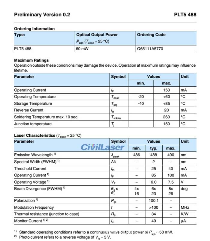 1. Optical output power: 60mW CW
