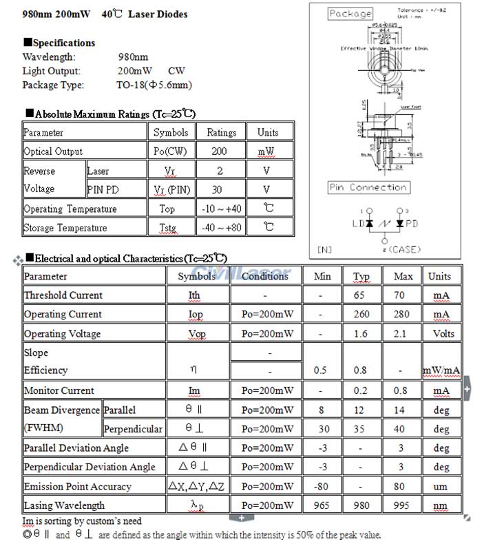 JDSU 980nm 200mW Infrarrojo Diodo láser Infrarrojo Remote Control Optical Applications
