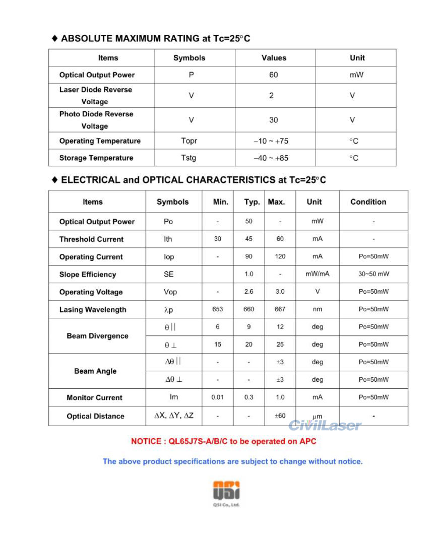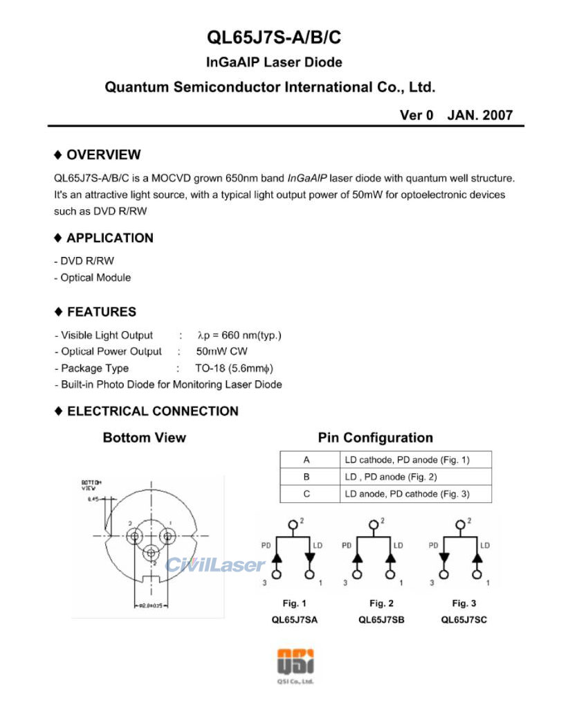 QL65J7S-A/B/C is a MOCVD grown 650nm band InGaAlP laser diode with quantum well structure. It's an attractive light source, with a typical light output power of 50mW for optoelectronic devices such as DVD R/RW.