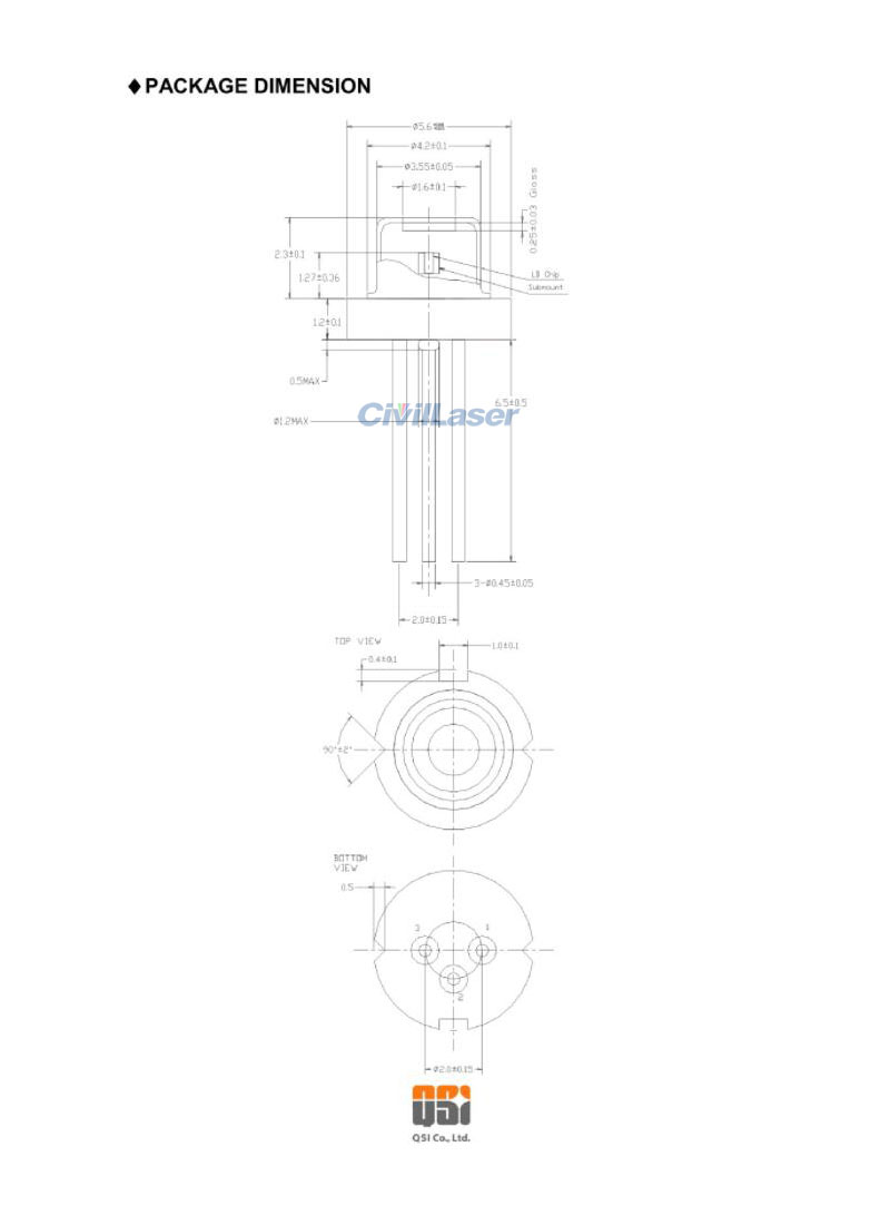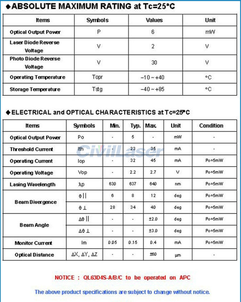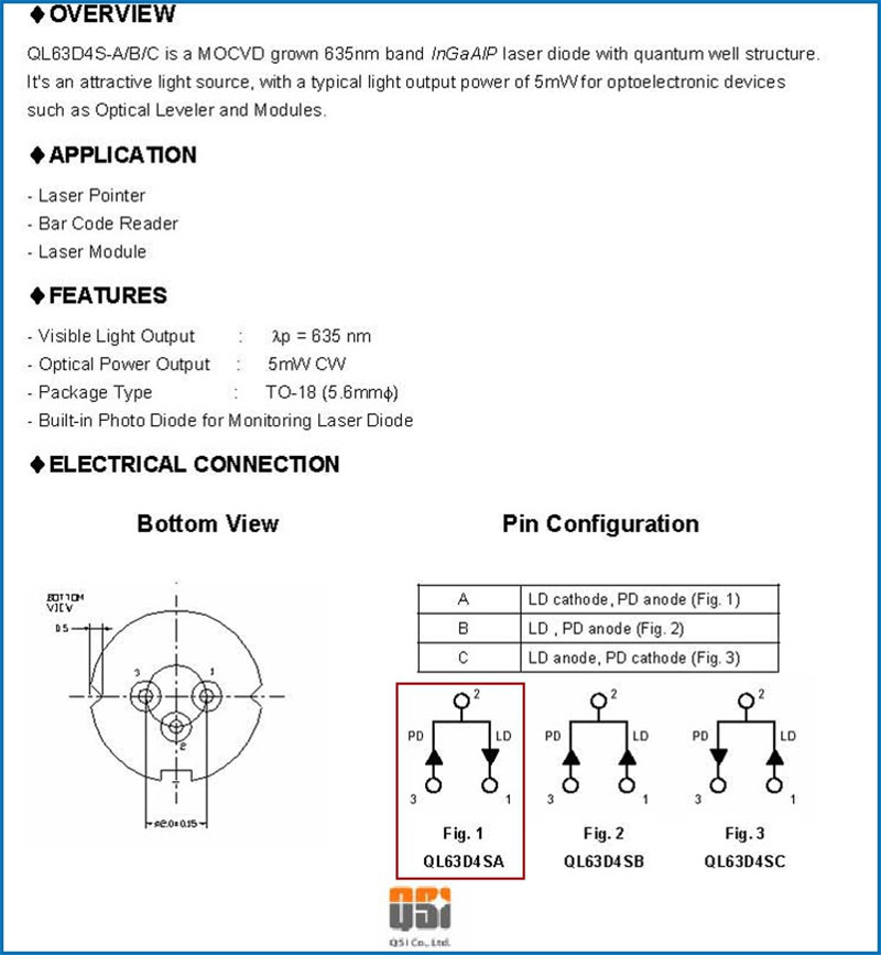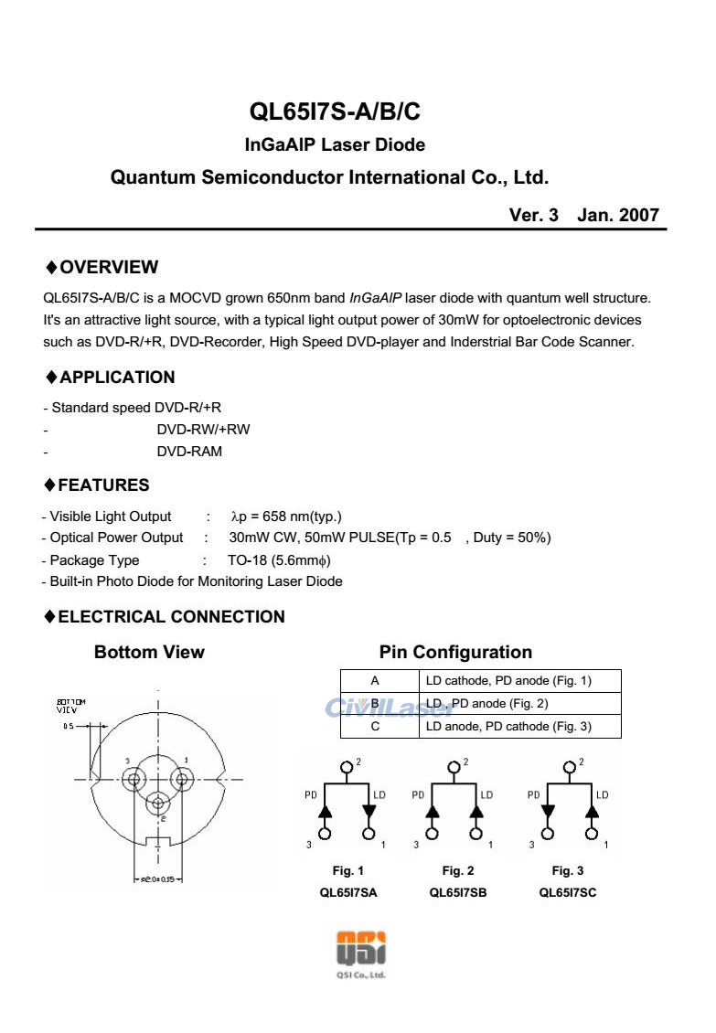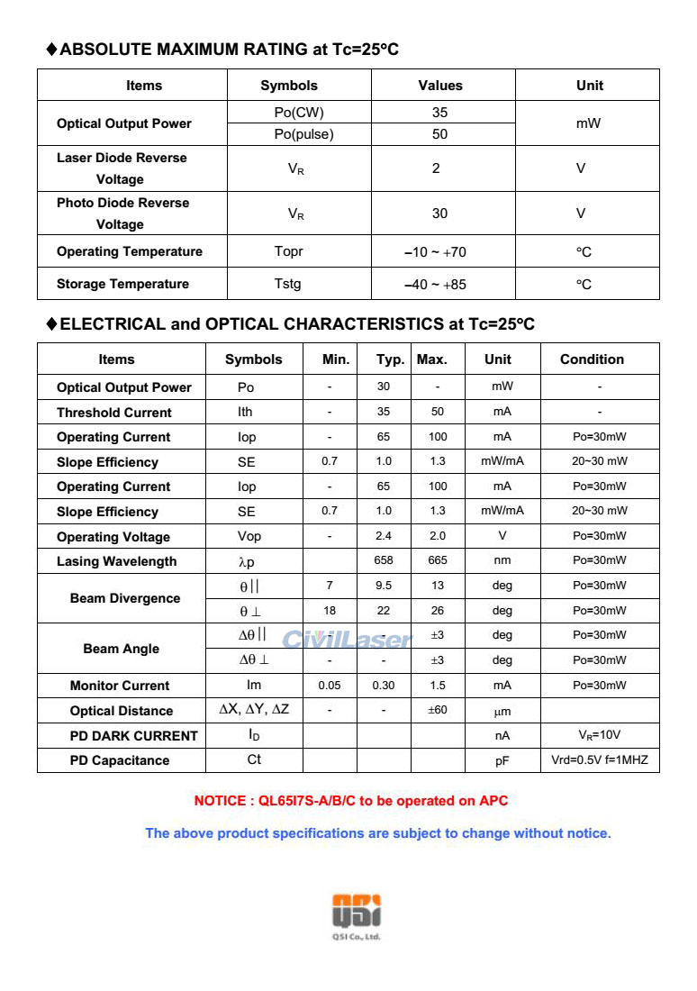 QL65I7S-A/B/C is a MOCVD grown 650nm band InGaAlP laser diode with quantum well structure. It's an attractive light source, with a typical light output power of 30mW for optoelectronic devices such as DVD-R/+R, DVD-Recorder, High Speed DVD-player and Inderstrial Bar Code Scanner.
