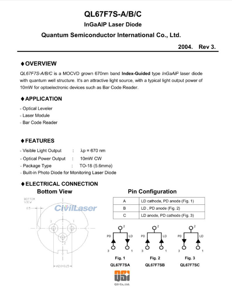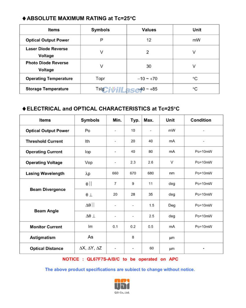 QSI 670nm 10mW Rojo Módulo láser Diode QL67F7S LD TO-18 5.6mm