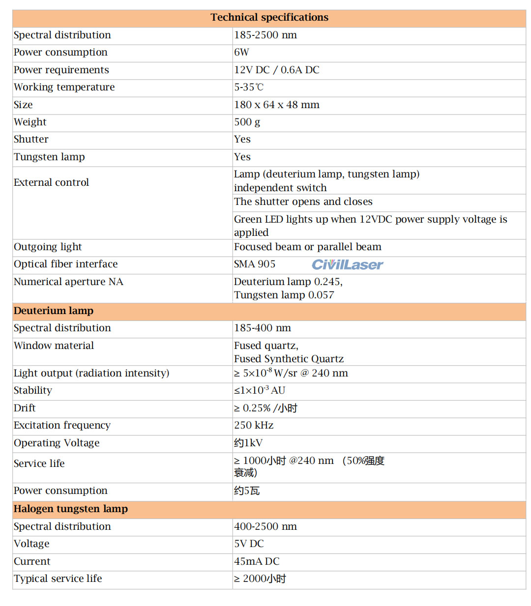 El mini sistema DH es una fuente de luz UV-Vis-Nir completa, que incluye lámpara de deuterio, lámpara de tungsteno de 0,25 W, obturador, sistema de trayectoria de luz e interfaz SMA905. Todos los componentes están instalados en una fuente de alimentación de 12V DC / 600mA. La lámpara de deuterio, la lámpara de tungsteno y el obturador se pueden controlar de forma independiente mediante la señal TTL.