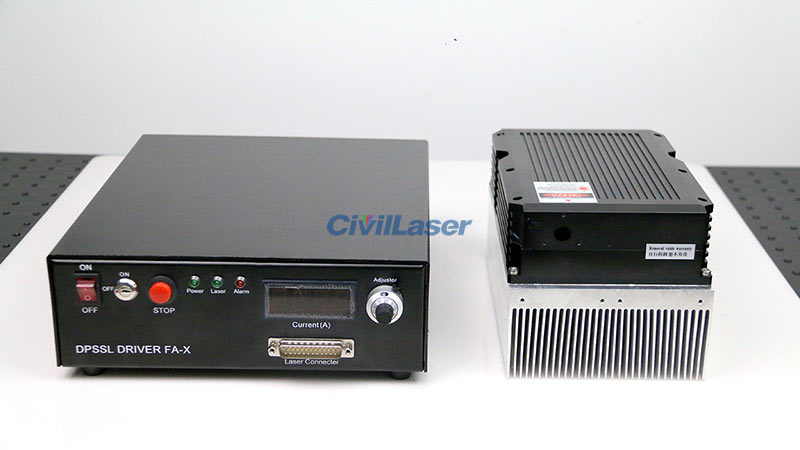 Este es un sistema láser verde de 515 nm y 10 W. Tiene tres modos de trabajo que se pueden elegir: CW, TTL y modulación analógica. Durante la instalación, si el láser necesita funcionar continuamente durante mucho tiempo, conecte la potencia del ventilador del radiador. Podemos ajustar la potencia del láser con el botón. Comprobémoslo ahora.