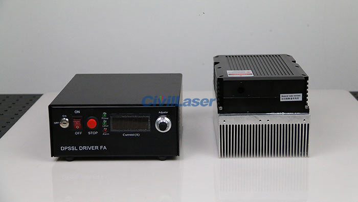 Es un sistema láser semiconductor rojo de 638 nm y 6 W. El cabezal láser agregó un radiador, admite un trabajo continuo más prolongado. El radiador está compuesto por chapa de aluminio y ventilador de refrigeración. Hay modo de trabajo CW / TTL / Analog 3. Su rayo láser rojo de alta potencia, necesitamos usar gafas protectoras. La potencia del láser de 0 ~ 6W se puede ajustar con el botón. Vamos a comprobarlo ahora.