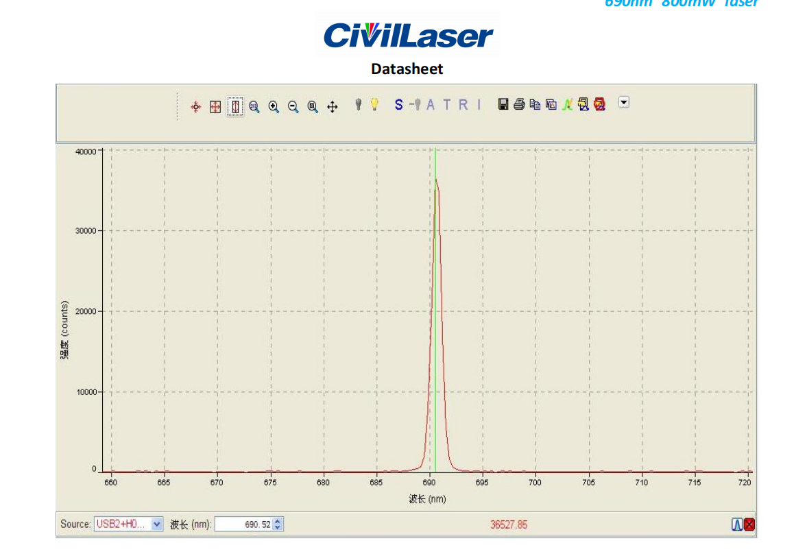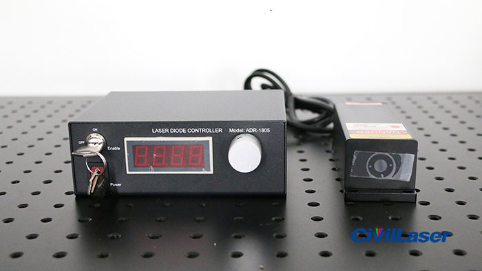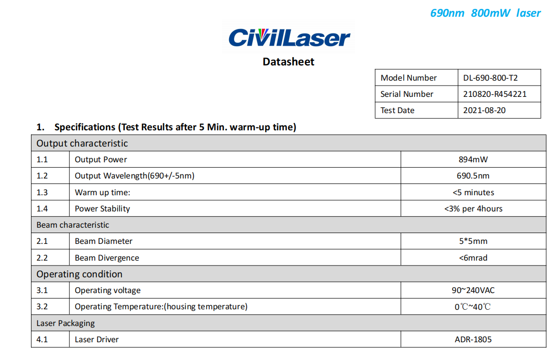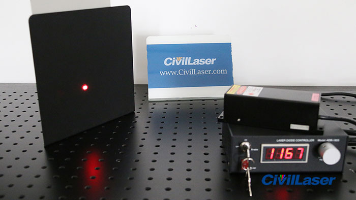 Este es un láser semiconductor rojo de 690 nm y 800 mW. El láser de 690nm es una fuente de láser rojo, entre el láser rojo, 690nm pertenece al láser de longitud de onda más larga. La potencia del láser es ajustable de 0 a 800 mW. Encienda el láser, gire el botón para ajustar la potencia del láser al máximo. Vamos a comprobarlo ahora.