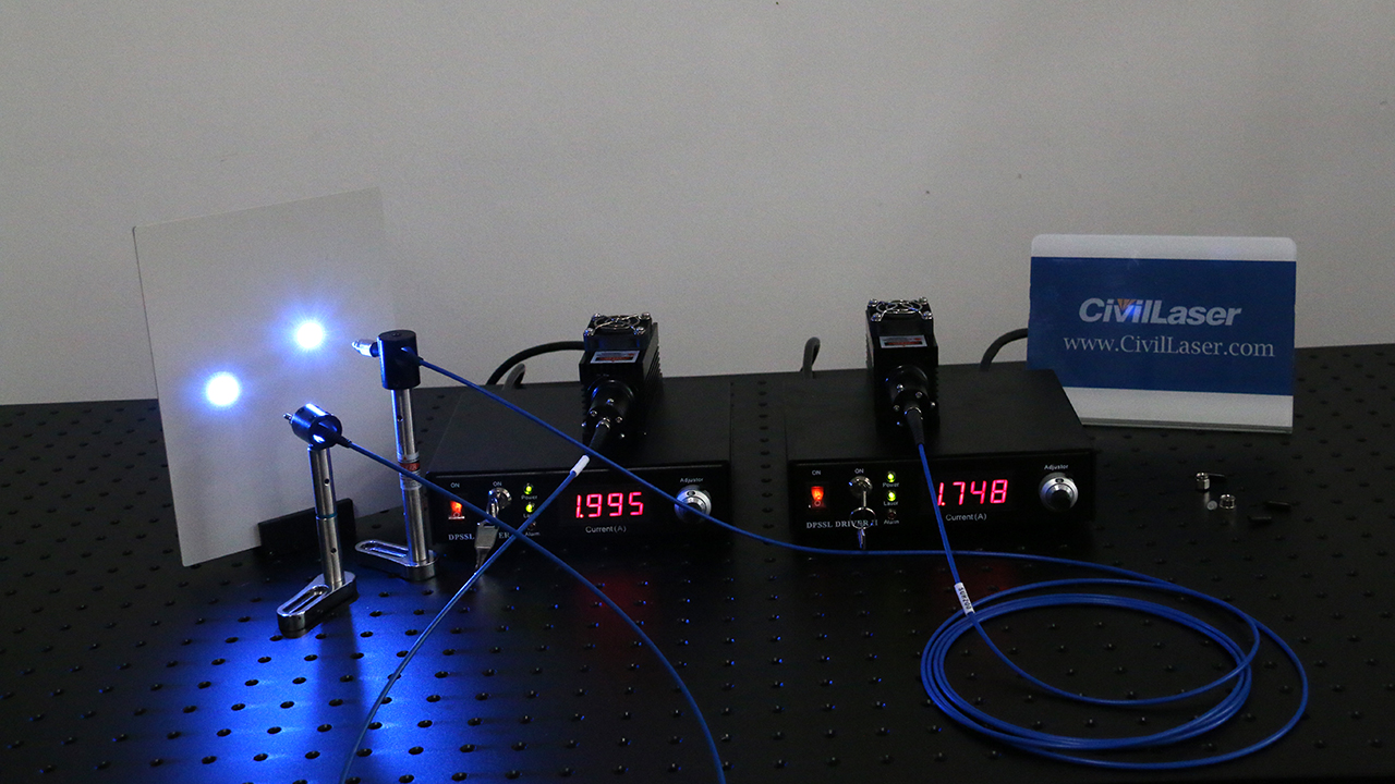 Se trata de dos láseres de estado sólido de 473 nm y 100 mW. Usamos dos láser acoplados de fibra azul de 100 mW. Uno de ellos es una fibra de 1 metro de largo, 600 μm de diámetro del núcleo y la interfaz de fibra es SMA905. El otro es de fibra de 3 metros, 200 μm de diámetro del núcleo y la interfaz de fibra es FC / PC. Ambos son láser de estado sólido de 473 nm. Comprobémoslo ahora.