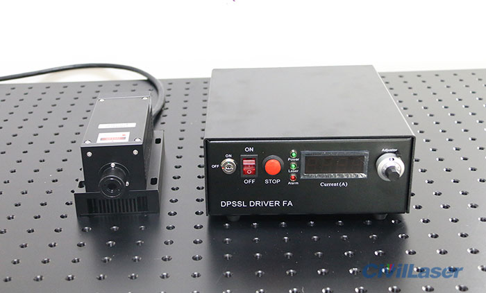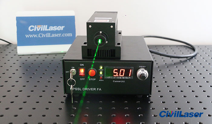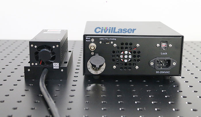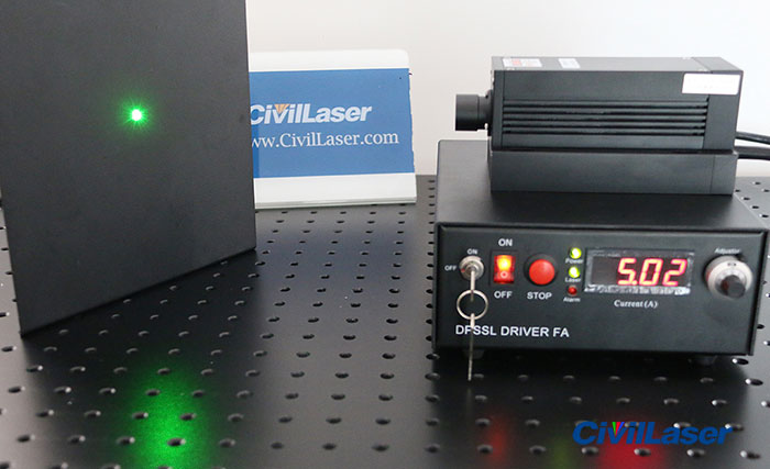 Es un sistema láser DPSS de 543 nm 10 mW. La parte posterior del cabezal láser está equipada con un ventilador de enfriamiento. Hay 3 modos de trabajo disponibles en la parte posterior de la fuente de alimentación del láser, CW, TTL y Analógico. El botón rojo se presiona para estar ENCENDIDO y la alimentación está encendida. Cuando la llave de seguridad está en ON, la salida láser comienza en este momento. Gire el botón ‘Ajustador’ y gírelo en el sentido de las agujas del reloj para aumentar la corriente, aumentando así la potencia de salida del láser. Comprobémoslo ahora.
