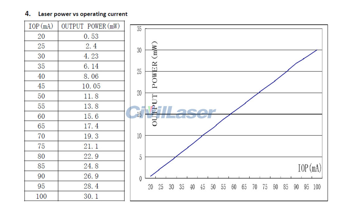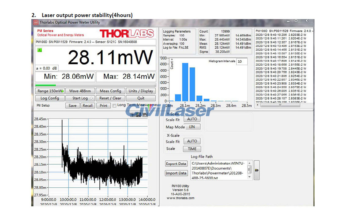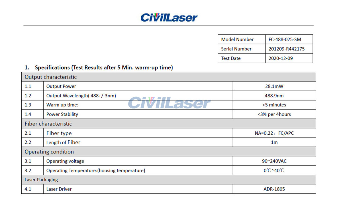 Informe de datos de prueba del laser de fibra acoplada SM de 488 nm 25 mW.