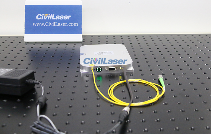 Esta es una fuente de luz SLD de 1550 nm y 10 mW de tipo módulo. Está equipado con una fibra monomodo. Se puede personalizar la versión de potencia ajustable. Cuando se selecciona el ajuste de potencia, el ajuste de potencia se controla a través de la comunicación serie RS232. La versión estándar es un modo de potencia fija, la fuente de luz se controla mediante el botón. Lo probamos con una película fotosensible infrarroja y pudimos ver un punto de luz. Vamos a comprobarlo ahora.