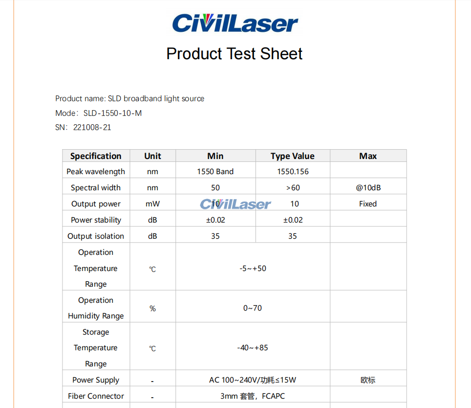 La fuente de luz de banda ancha SLD adopta un chip emisor de luz de diodo semiconductor súper radiante, que emite un espectro de banda ancha con un bajo grado de coherencia y una alta densidad espectral de potencia óptica de salida. La longitud de onda operativa se puede seleccionar entre O, S, C, L y otras bandas, adecuadas para OCT óptico, aplicaciones de detección de fibra óptica.