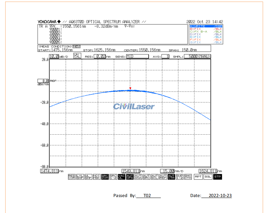 El informe de datos de prueba y el espectro de la fuente de luz de 1550 nm.
