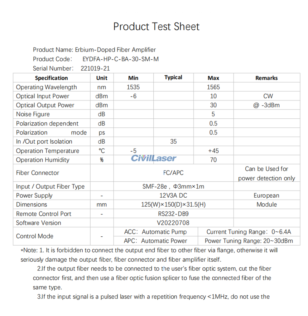 Amplificador de fibra dopada con erbio de alta potencia (EYDFA-HP-BA), basado en la tecnología de amplificación de fibra dopada con erbio de doble revestimiento, tecnología de empaquetado óptico única y con un diseño confiable de protección de trayectoria de luz de hardware, salida láser de alta potencia realizada en banda C o banda L , Tiene las ventajas de alta ganancia y bajo ruido, y puede ser ampliamente utilizado en CATV, comunicación por fibra óptica, radar láser, etc.